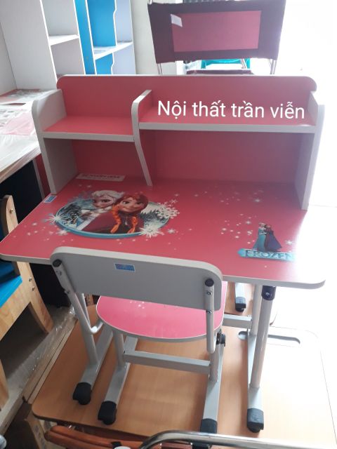 Mặt bàn, mặt ghế có dán decal nhân vật hoạt hình vui nhộn, được các bé ưa thích.