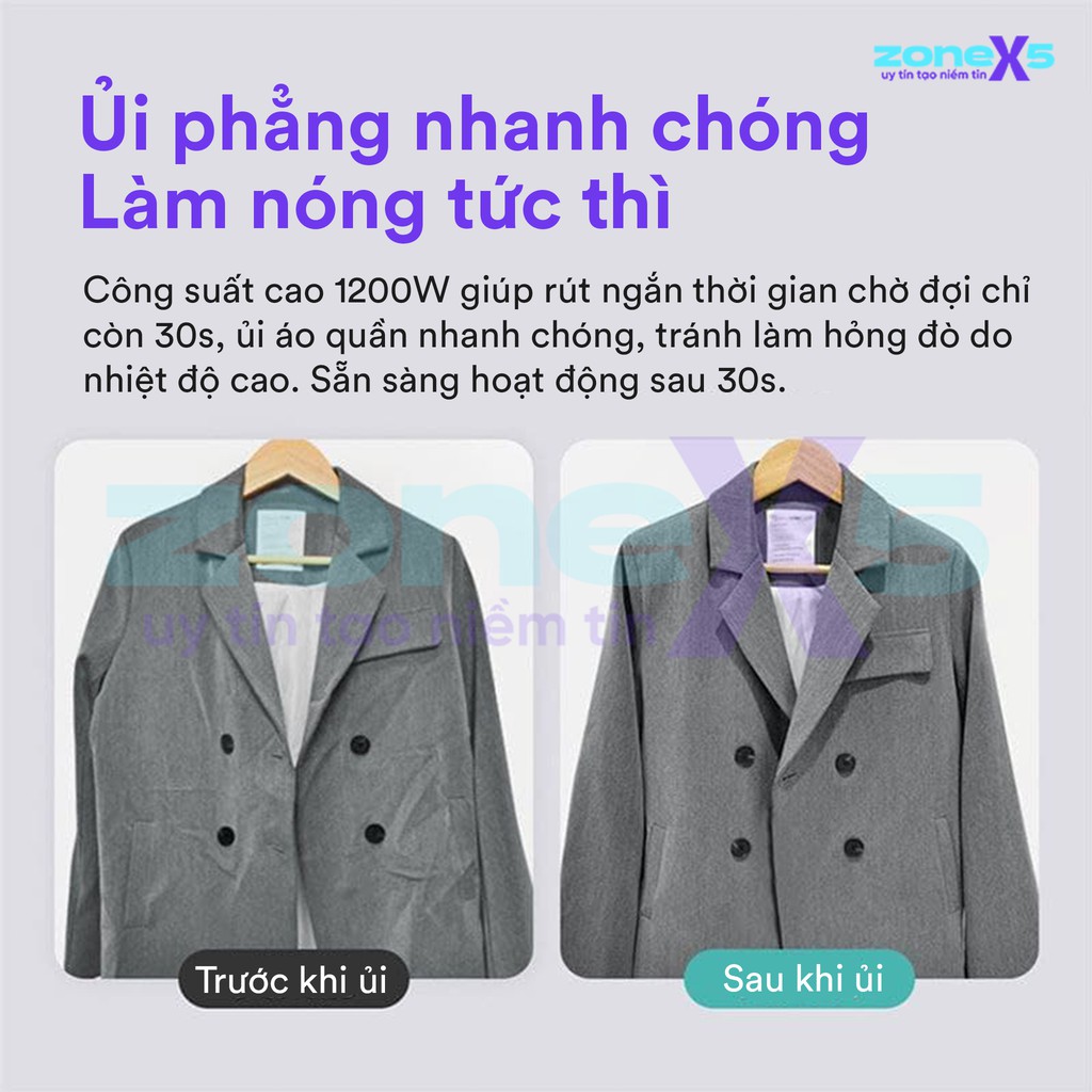 Công suất cao 1200W, tỏa nhiệt nhanh giúp giảm thời gian chờ, đồng thời ủi nhanh chóng, tránh làm hỏng đồ do nhiệt độ cao, sẵn sàng làm việc trong 30 giây.