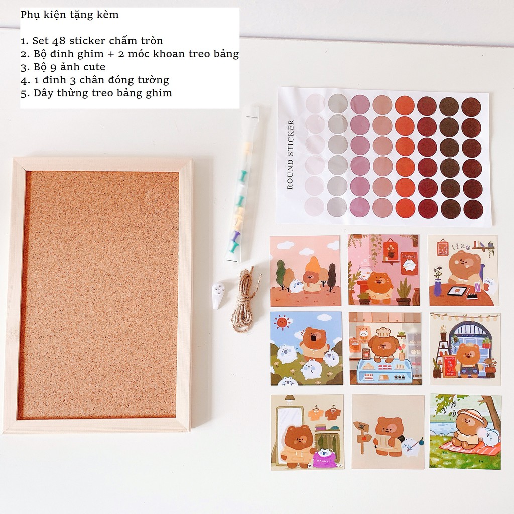 Bảng ghim gỗ ghi chú tin tức, ghim ảnh trang trí phòng, tặng kèm phụ kiện Sumi