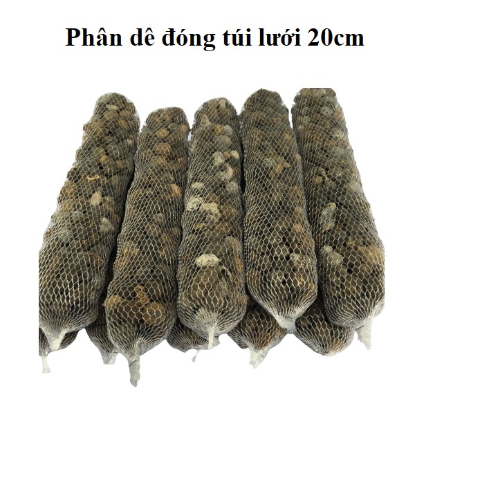 Bịch 10 túi phân dê đã qua xử lý phơi khô, đóng túi lưới 20cm tốt cho mọi cây trồngBón phân dê có thể giúp cây trồng khoẻ và năng suất cây trồng, thường không thu hút côn trùng như phân bón từ bò hay ngựa . Phân dê là hầu như không mùi và có lợi cho đất. phân này có chứa một lượng đầy đủ các chất dinh dưỡng mà cây cần cho sự tăng trưởng tối ưu. phân dê mát cho cây trồng, và nó có một độ pH cân bằng hơn và ít muối. Nó cũng khô hơn nhiều so với phân gà, dạng viên nhỏ, không mùi. Mặc dù phân dê có thể chứa một số hạt cỏ dại, tổng thể nó dường như không thu hút giòi và ruồi dễ dàng như phân gà.