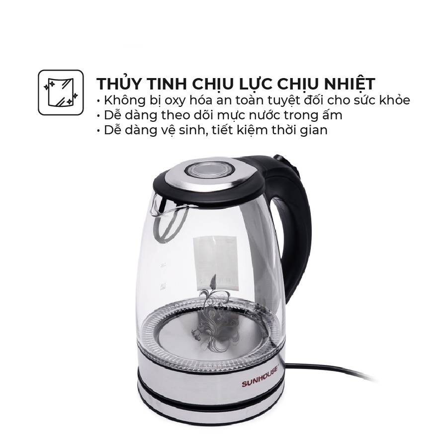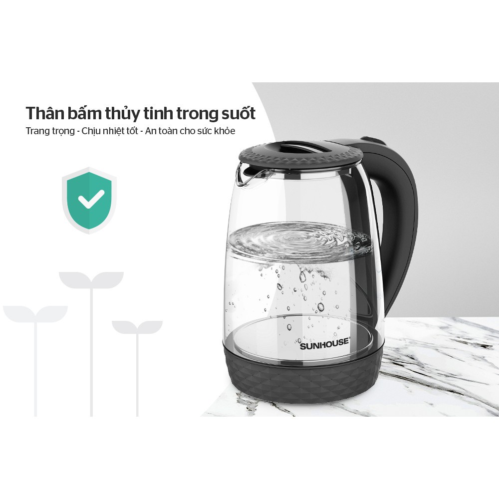 Bình Đun Nước Siêu Tốc Thuỷ Tinh Trong Suốt Chịu Nhiệt Cao- Ấm Siêu Tốc Thuỷ Tinh SUNHOUSE 1.8 L SHD1215