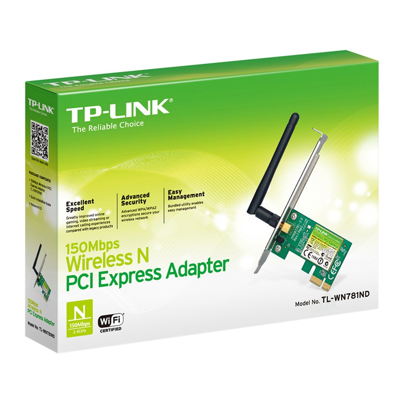 Thông tin sản phẩm.. Card mạng TP-Link TL-WN781ND.. Cung cấp hiệu suất không dây hoàn chỉnh.Thiết bị card mạng TL-WN781ND của TP-LINK được thiết kế để cung cấp hiệu suất không dây hoàn chỉnh hoàn chỉnh từ máy chủ để chuyển đổi kết nối cố định xuống thông qua máy tính để bàn với kết nối PCI Express.... Khả năng tương thích rộng.TL-WN781ND cung cấp khả năng tương thích rộng, phù hợp với các tiêu chuẩn PCI Express slot x 1, x 2, x 8, hay x1 6. So với card mạng PCI, thiết bị cung cấp băng thông cao hơn với tốc độ lên tới 150Mbps, tin cậy và nhiều chức năng hơn, cho phép bạn tận hưởng kết nối nhanh và mạnh chẳng hạn như tải về, thực hiện các cuộc gọi internet và xem video trực tuyến.... Chế độ bảo mật WPA/WPA2Thiết bị TL-WN781ND được trang bị chế độ bảo mật WPA/WPA2. Tính năng này do tập đoàn công nghệ Wi-Fi Alliance thiết kế ra nhằm thúc đẩy khả năng bảo mật đối với WLAN.Giá RPC