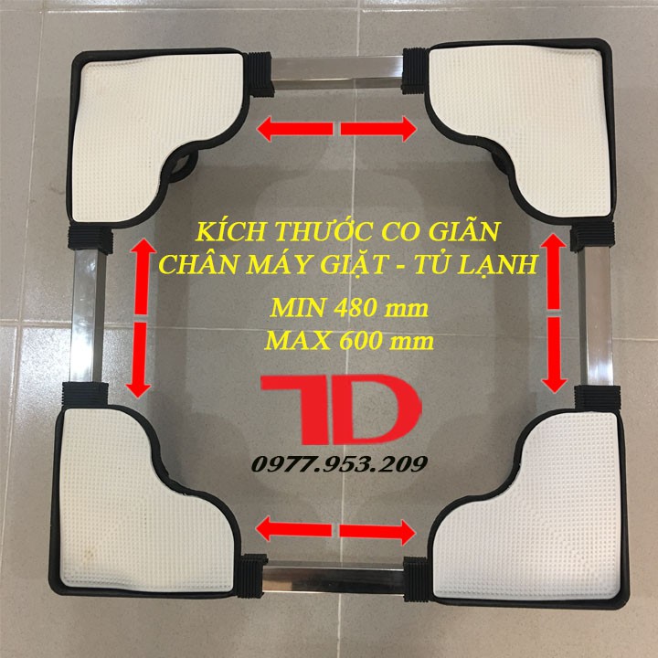 Chân đế có thể thay đổi được cả chiều dài và chiều rộng từ 52-80cm tùy chỉnh theo kích thước máy giặt, tủ lạnh.