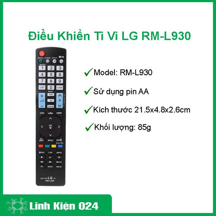 Điều Khiển Ti Vi LG RM-L930Điều khiển từ xa được sử dụng rộng rãi trong ngành điện tử gia dụng và giải trí. Phần lớn các thiết bị điện tử như TV, đầu đĩa, máy điều hòa, quạt... đều có điều khiển từ xa đi kèm. Sau đây Linh Kiện Điện 024 sẽ giới thiệu các bạn Điều Khiển Ti Vi LG RM-L930 đang được thông dụng trên thị trường, dùng cho nhiều dòng ti vi LG hiện nay.