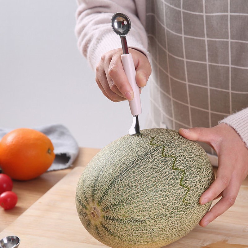 Muỗng hai đầu được thiết kế gồm 2 đầu, một đầu dùng để múc các loại quả mềm như dưa hấu, đu đủ, thanh long… một đầu để tỉa rau củ, hoa quả, cho bạn gái thể hiện sự khéo léo và cắt tỉa nhiều dĩa hoa quả bắt mắt cho cả gia đình.
