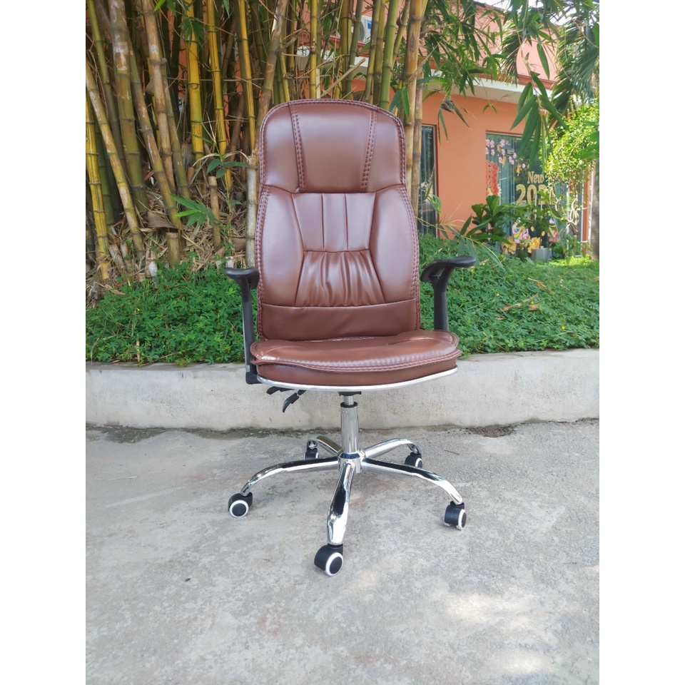 Đây là một mẫu ghế giám đốc hay ghế trưởng phòng có thiết kế khá đẹp mắt và sang trọng. Mặt ngồi và lưng ghế được thiết kế với lớp nệm mút dày, kiểu dáng ôm lưng giúp người ngồi có thể thoải mái và thư giản. Hai bên là hai phần tay dựa rất gọn và tiện dụng. Bên dưới là kết cấu chân ghế với chất liệu sắt mạ Crome sáng bóng sang trọng. Thêm vào đó là phần bánh xe lăn giúp bạn có thể dễ dàng di chuyển qua lại.Giữa phần chân ghế và mặt nệm ghế là bộ phận tăng thủy lực giúp bạn có thể dễ dàng cân chỉnh chiều cao của ghế, phù hợp với chiếu cao mặt bàn sử dụng. Mẫu ghế này còn một đặc điểm nỗi bật mà bạn không thể bỏ qua đó là phần lưng ghế có thể ngã ra phí sau, cho bạn một trãi nghiệm thư giản không thể tuyệt vời hơn trong những giờ giải lao, nghỉ trưa…