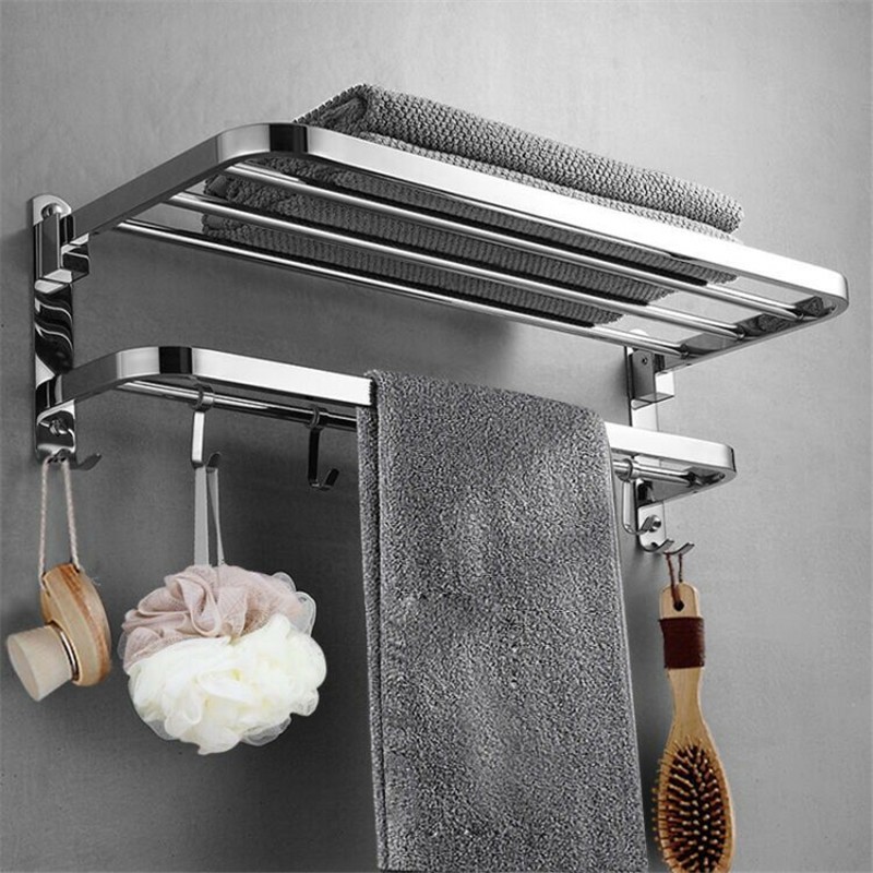 Giá treo đồ nhà tắm INOX SUS 304, Kệ gập 2 tầng vắt khăn phòng tắm lắp đặt dán tường hoặc khoan