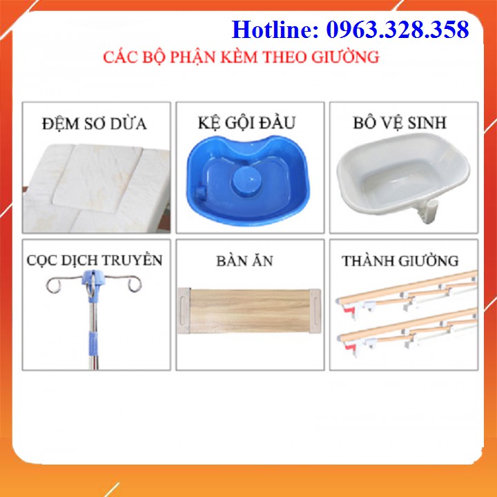 - Đệm xơ dừa dày 7cm có thể tháo rời từng tấm để thay, giặt, vệ sinh. Vỏ ga tháo thay được. Giường bệnh điều khiển hoàn toàn bằng hệ thống điện giúp người bệnh có thể tự điều khiển nâng đầu, nâng chân, lật người bằng bảng điều khiển mà không cần hộ lý hay người nhà hỗ trợ.