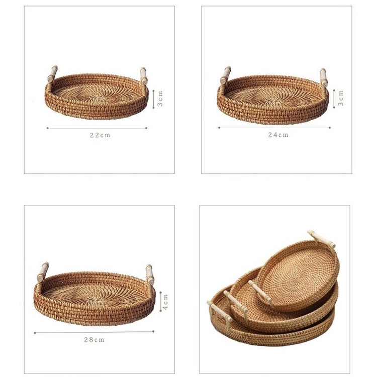 Khay mây tròn có tay cầm, giỏ mây decor đựng đồ ăn vintage:THÔNG SỐ KHAY MÂY TRÒN:
