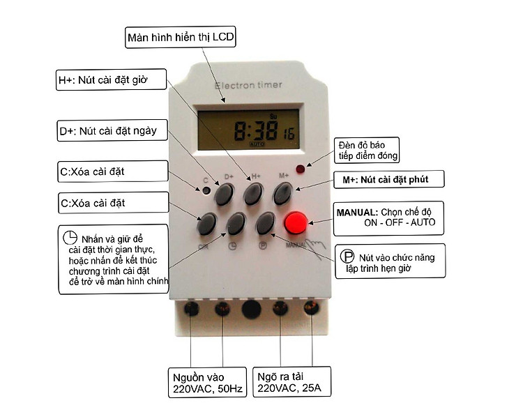 - Bộ hẹn giờ thông minh có thiết kế nhỏ gọn, màn hình LCD có độ hiển thị cao giúp người dùng dễ dàng cài đặt và hiệu chỉnh các thông số