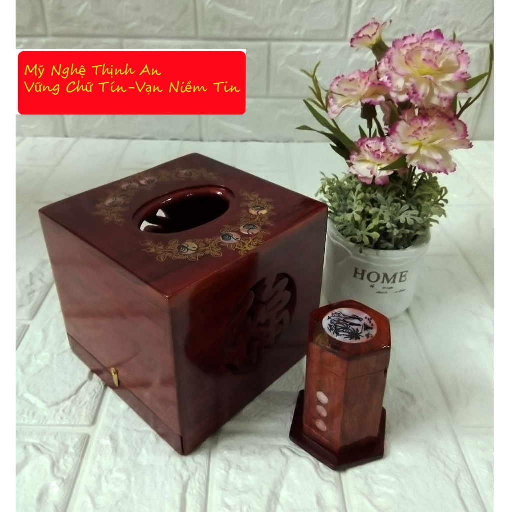 Nhà cửa & Đời sống > Sắp xếp nhà cửa > Hộp khăn giấy || Hộp khăn giấy gỗ hương ta đỏ lọng chữ phúc vuông kèm ống tăm CGV01Còn hàng