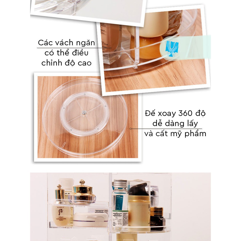 KỆ ĐỰNG MỸ PHẨM TRONG SUỐT HÌNH TRÒN XOAY 360 ĐỘHộp nhựa được thiết kế hình trụ tròn, với rất nhiều ngăn, ô nhỏ, nhiều tầng... thuận tiện để các chị em phân loại và sắp xếp các lọ mỹ phẩm, dụng cụ trang điểm và những đồ cá nhân khác. Hộp có kích thước lớn nên thoải mái để các lọ mỹ phẩm cao, to mà không lo vị rơi vỡ nữa.