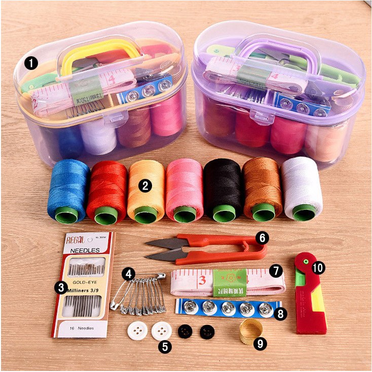 - Bao gồm: 1 hộp đựng, 7 cuộn chỉ các màu, 1 hộp kim các loại, 01 kéo cắt chỉ, 01 thước dây, 10 kim băng, 04 cúc áo, 01 nhẫn ấn kim, 5 cúc bấm, 1 dụng cụ luồn chỉ