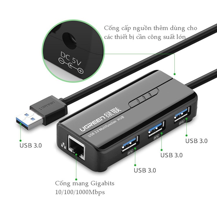HUB USB 3 cổng 3.0 kèm cổng mạng LAN 10/100/1000 Mbps UGREEN CR103 20265 - Hàng phân phối chính hãng - Bảo hành 18 thángHub USB 3.0 mở rộng cho bạn thêm 3 khe cắm tốc độ cao lên tới 5Gb/s