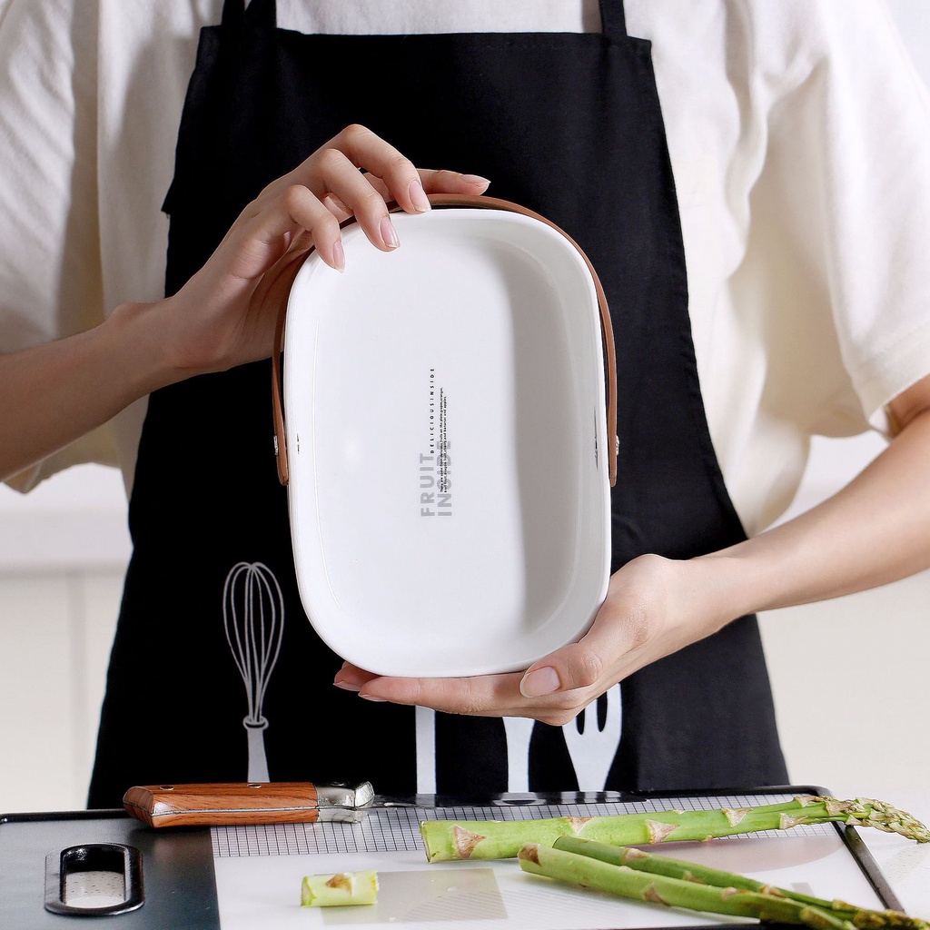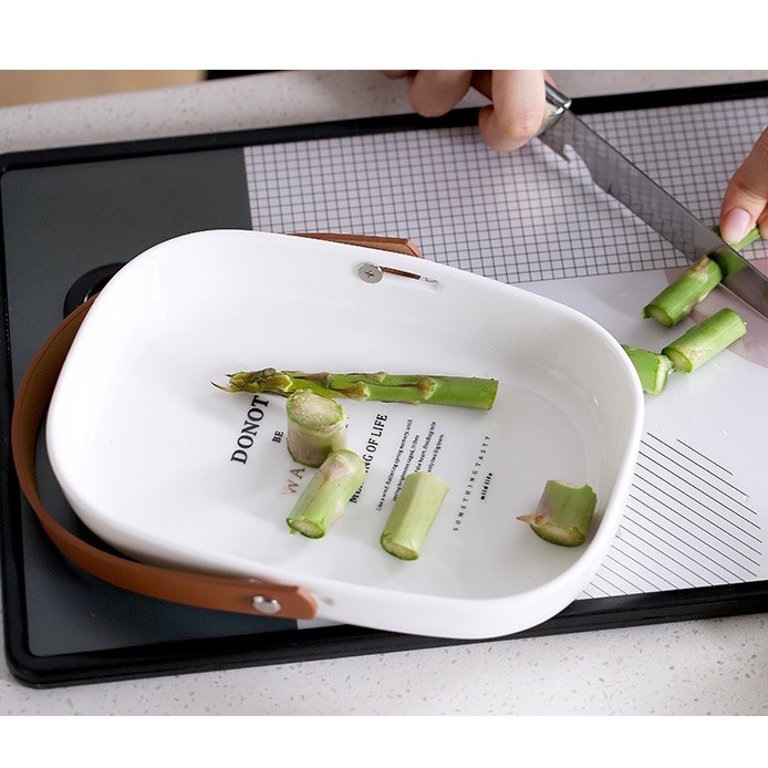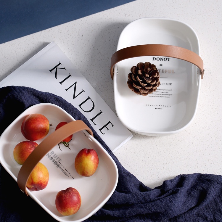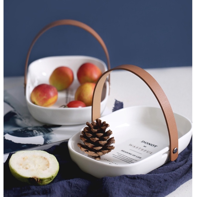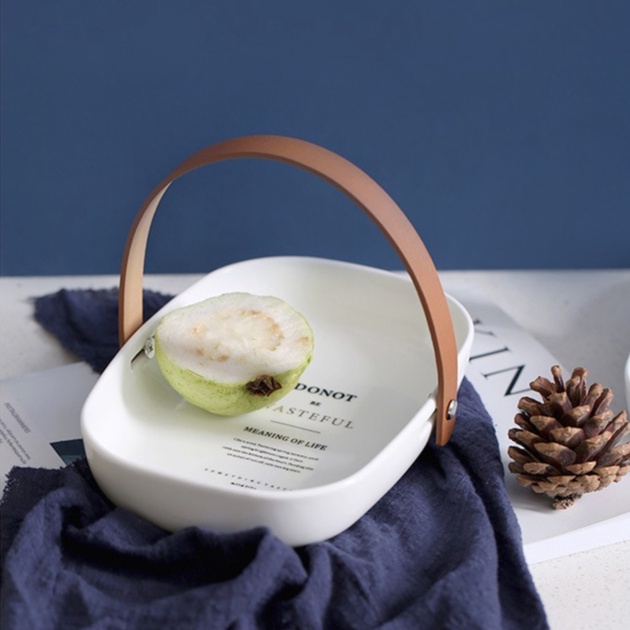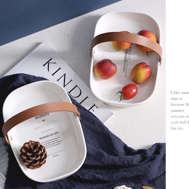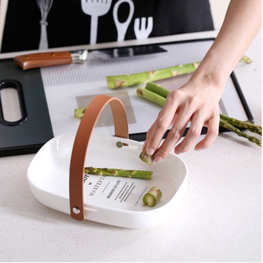 Khay sứ đựng đồ ăn có tay cầm bằng da cao cấp dùng decor phụ kiện chụp ảnh món ăn