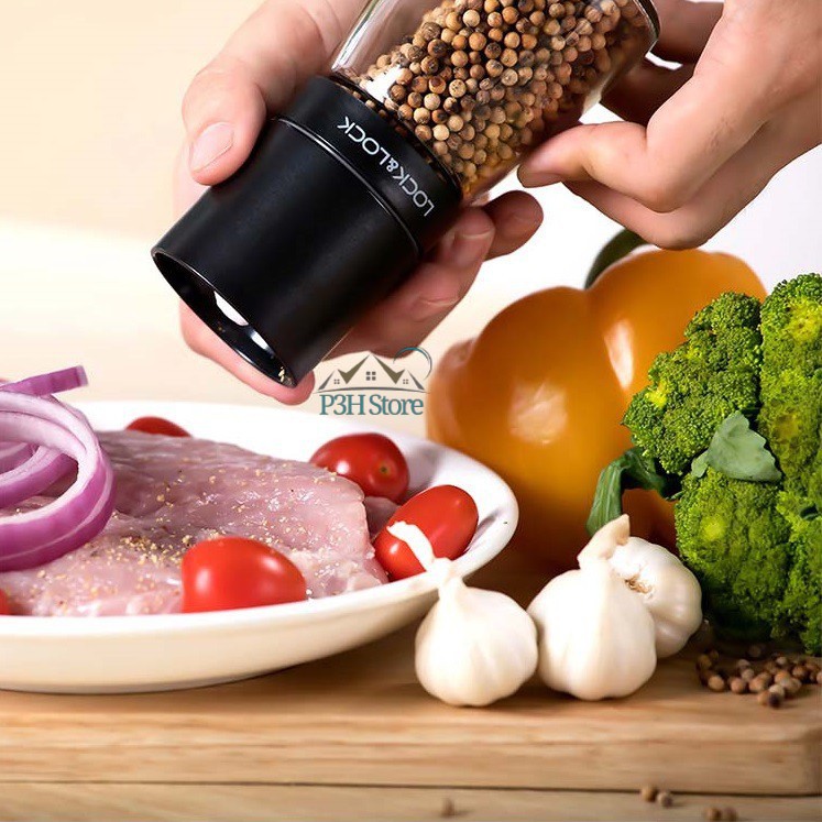 - Kiểu dáng nhỏ gọn, đẹp mắt, thân bằng thủy tinh trong suốt, nắp đậy kín đáo kết hợp chức năng xay nhuyễn và rắc tiêu.