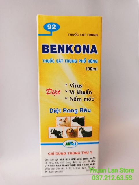 Thuốc trị nấm BenkonaSản xuất từ hoạt chất Benzalkonium Chloride 100g; Amyl acetate 0,1ml; Glutaraldehyde.