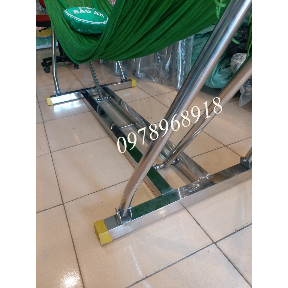 Khung võng xếp inox vuông khung và lướiKhung võng xếp inox vuông là loại khung võng đế vuông phi 40 chất liệu inox 100%, sáng bóng không rỉ sét. Thiết kế đế vuông vững chắc không bị rung nảy khi đung đưa võng. Hàng chính hãng bảo hành 12 tháng.