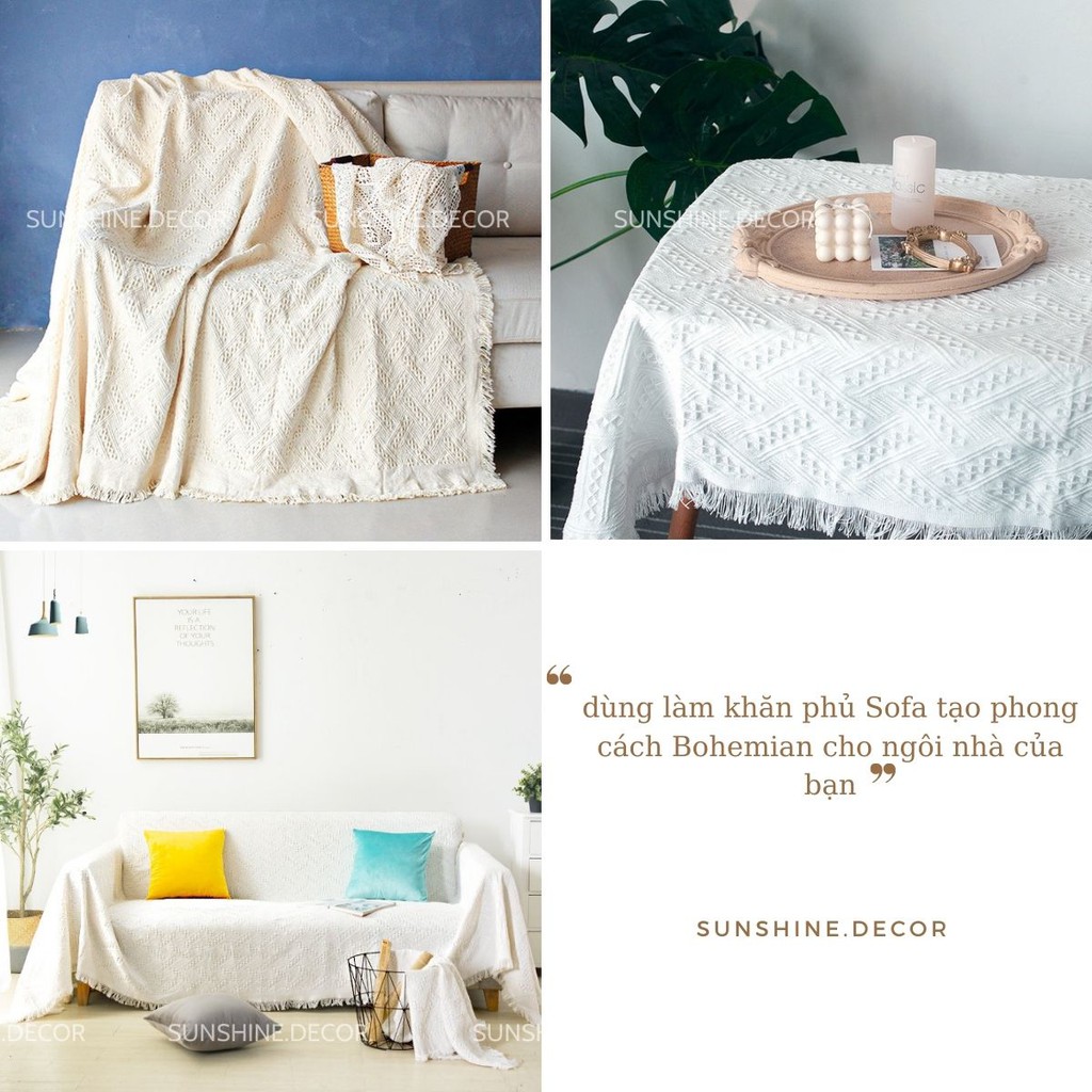 Với tấm khăn này bạn có thể dùng làm khăn phủ Sofa, vừa tránh bụi bẩn, vừa làm chăn đắp, vừa trang trí cho ngôi nhà của mình. Hay dùng như một tấm thảm picnic màu trắng vừa sang vừa cá tính chụp ảnh siêu đỉnh.