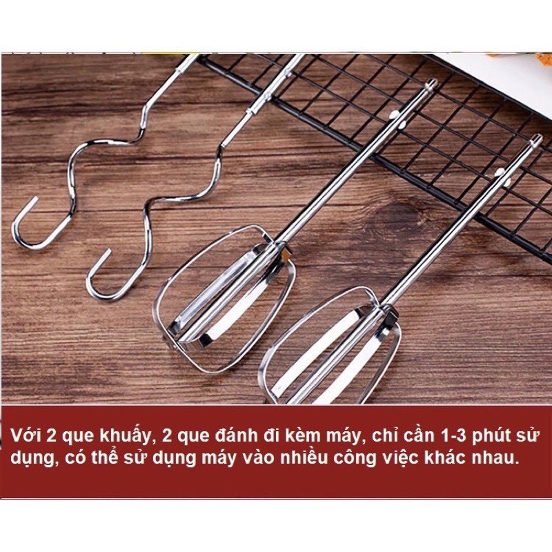 - Máy trang bị 4 que , 2 que trộn và 2 que mốc nhào (bột lỏng) làm bằng inox không gỉ cao cấp, đảm bảo chất lượng, vệ sinh cho hỗn hợp trứng, kem, bột. Bộ dụng cụ hữu hiệu dùng cho các chức năng đánh trứng, và các loại thực phẩm khác
