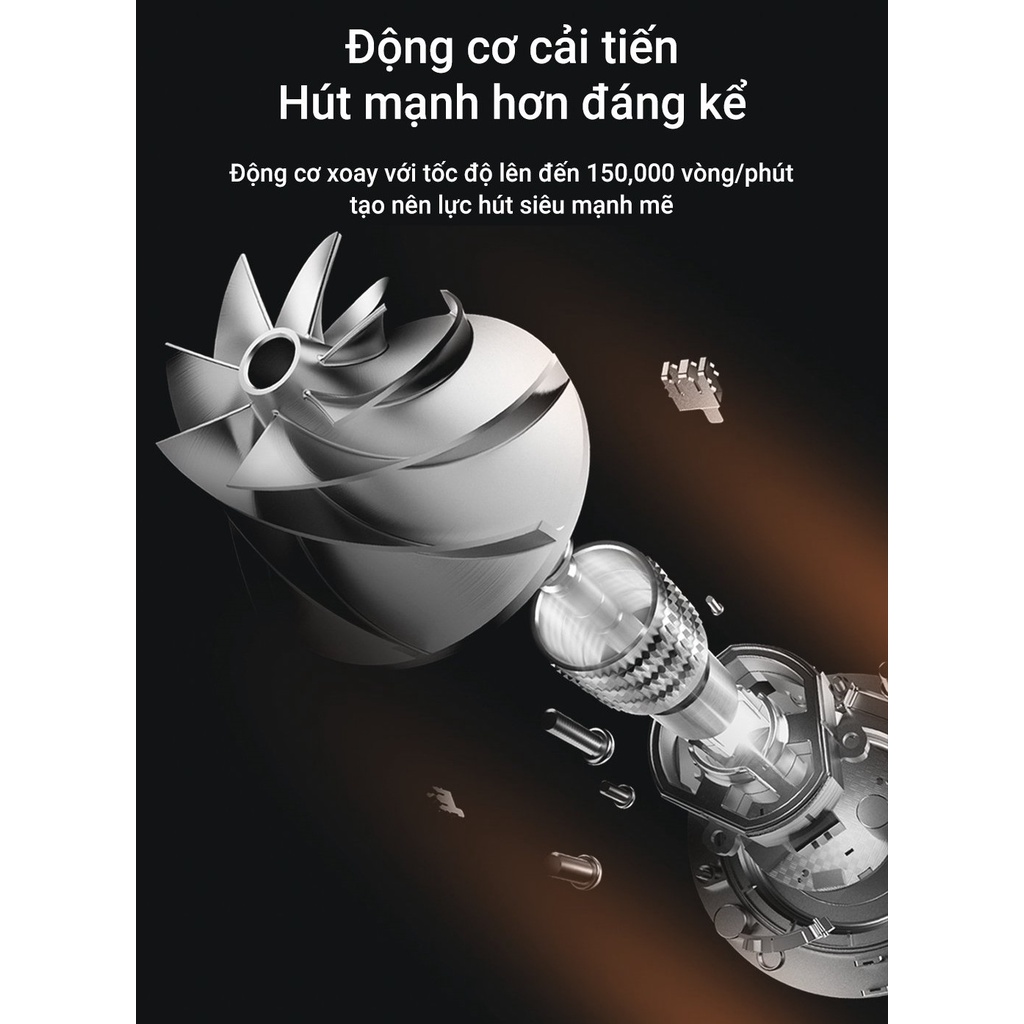 Dreame độc quyền động cơ hút công suất cao Space 5.0, với khả năng hoạt động chỉ trong 0.3 giây. Động cơ xoay đặt tốc độ 150000 vòng/phút giúp đảm bảo hút sạch mọi bụi bẩn, lông tóc và mảnh vụn nhanh chóng và hiệu quả. Ngoài ra, động cơ này còn có khả năng hoạt động liên tục trong thời gian dài, giúp người sử dụng làm sạch trên diện rộng.