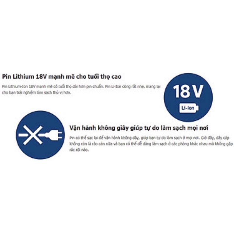 Máy hút bụi Philips được thiết kế không dây để tự do làm sạch ở bất cứ nơi nào bạn muốn trên mỗi loại sàn nhà và không túi giúp bạn đổ bỏ bụi ra khỏi thùng mà không cần phải chạm vào bụi bẩn. Ngoài ra, máy hút bụi còn có ưu điểm đó là sử dụng Pin Lithium Ion 18V mạnh mẽ cho tuổi thọ cao trong thời gian chạy đến 40 phút.