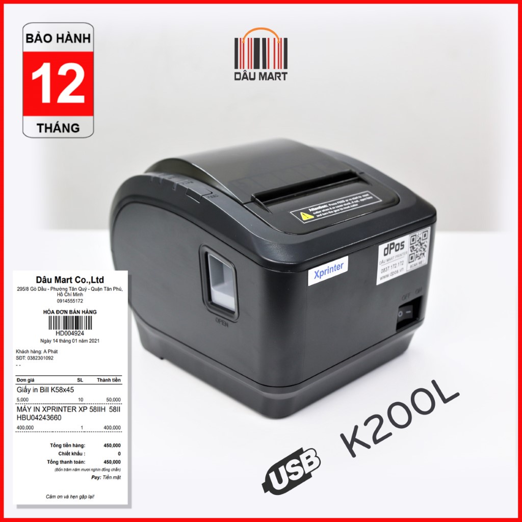 Máy in hoá đơn K80 dPos D200N và K200L USB in bill hóa đơn tính tiền POS sử dụng giấy in nhiệt 80mm cắt giấy tự động