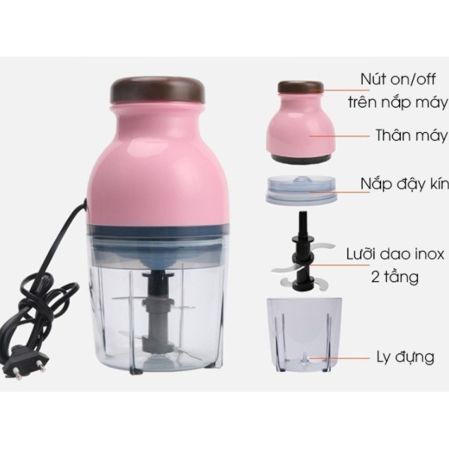 ❶ Gồm 3 phần chính, 1 motor với 2 cấp độ xay, 1 cối chứa thịt xay bằng nhựa, 1 lưỡi dao tác động kép.