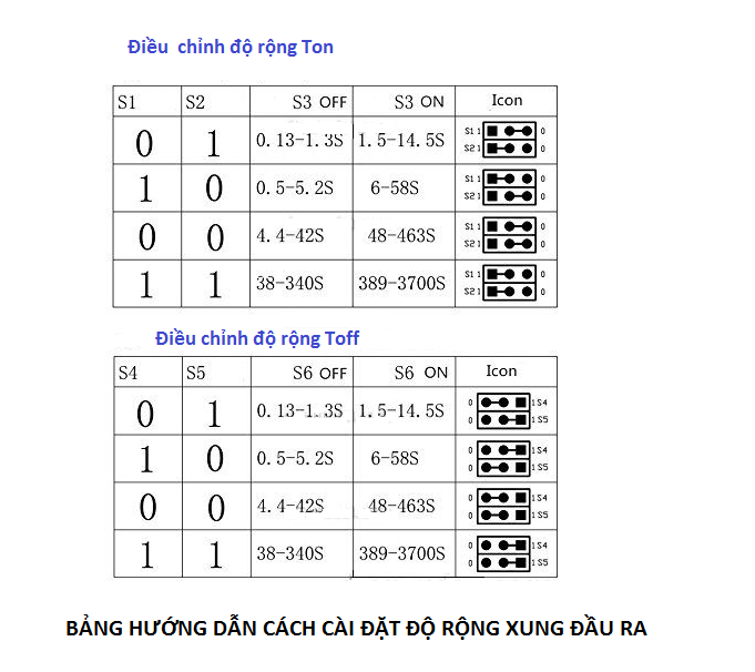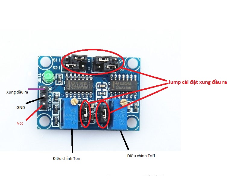 - Với việc cắm jump ở S1 đến S6 ta sẽ thiết lập khoảng rộng cho TON và TOFF , đồng thời dùng 2 biến trở để điều chỉnh chính xác khoảng rộng của TON và TOFF