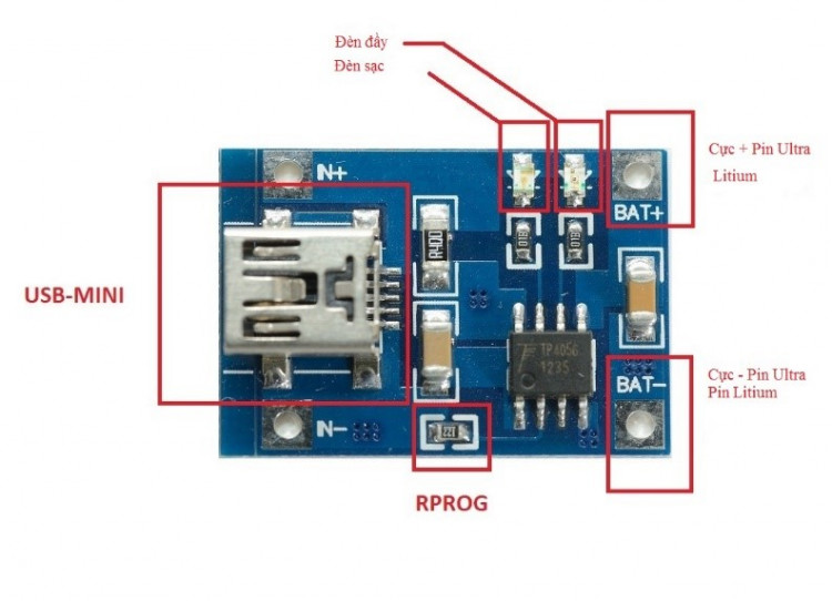 - Giao diện mạch sạc pin TP405 1A MiniUSB: