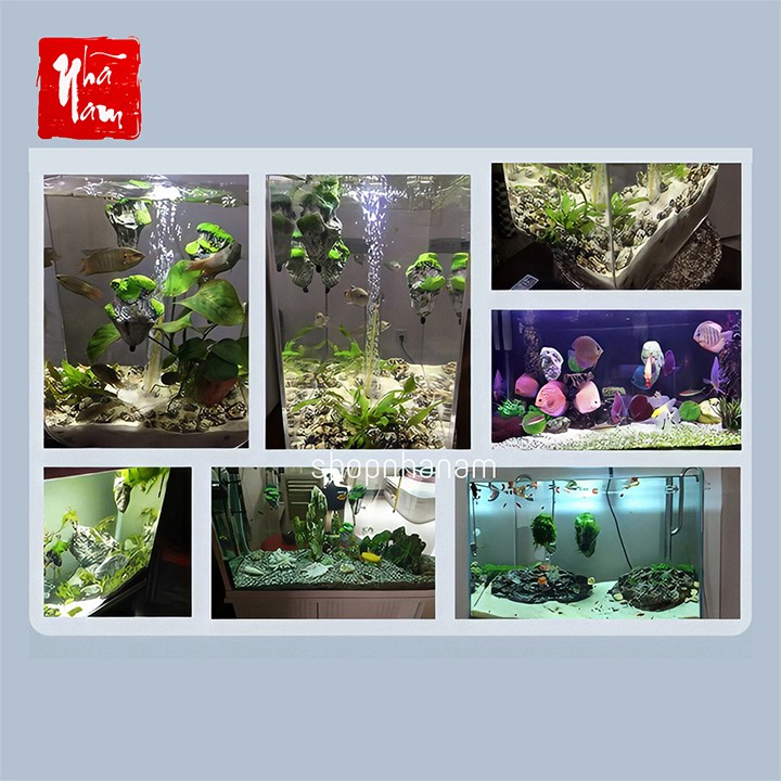 - Đặc tính: Được gắn với nhau bằng dây cốc hút và đá bọt, sau đó thả vào trong nước, cốc hút bám chặt vào đáy bể làm cho hòn non bộ lơ lửng giữa bể cá. Có thể điều chỉnh tùy ý độ dài của dây tạo cảnh quan sống động trong bể cá. Trên bề mặt non bộ có các lỗ nhỏ li ti có thể hấp thụ các vi khuẩn có hại và kim loại nặng trong nước.