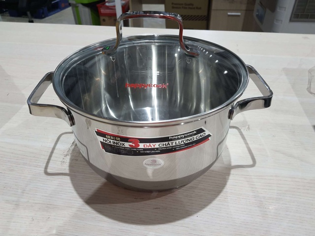 "Nồi inox cao cấp 3 lớp bếp từ Happy Cook thiết kế theo phong cách Hàn Quốc, mang đến sự sang trọng, tinh tế và hiện đại cho gian bếp của gia đình. Thiết kế phong cách nắp kính giúp người dùng vừa sử dụng vừa có thể quan sát thực phẩm bên trong để có độ chín theo ý muốn.Đáy Nồi có cấu tạo 3 lớp: