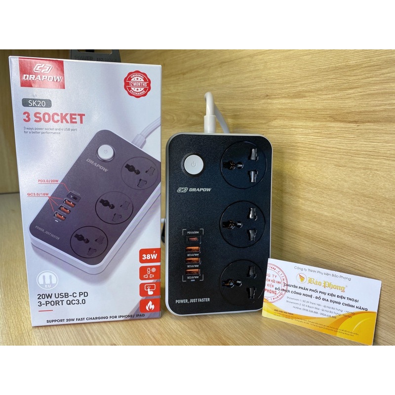 Ổ điện thông minh DRAPOW SK20 Sạc nhanh USB-C 20W PD cho iPhone iPad 3 cổng QC 3.0 18w ,3 ổ 220v IP 11 12 pro max x xs