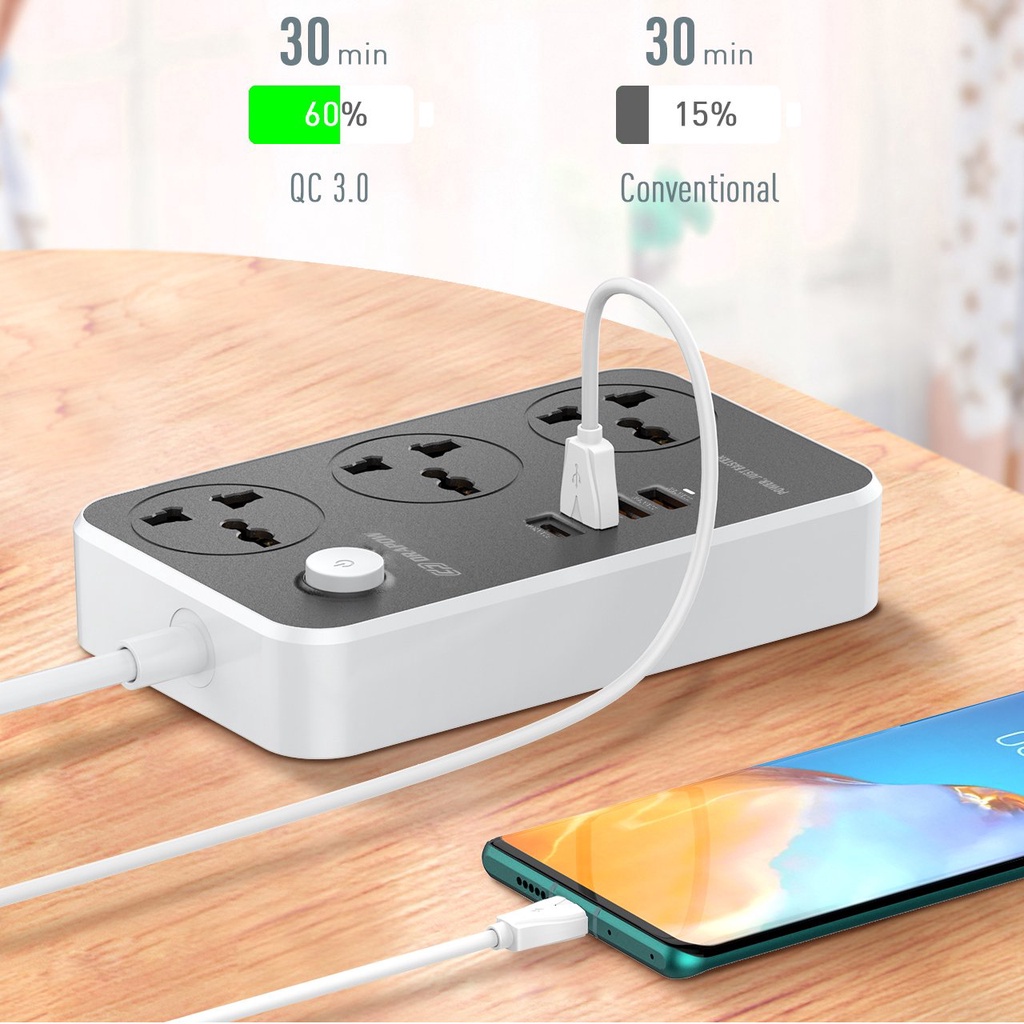 Không chỉ có 3 lỗ cắm điện đa năng, ổ cắm điện PD 20W Drapow SK20 còn tích hợp đến 3 cổng USB và 1 cổng PD sạc nhanh