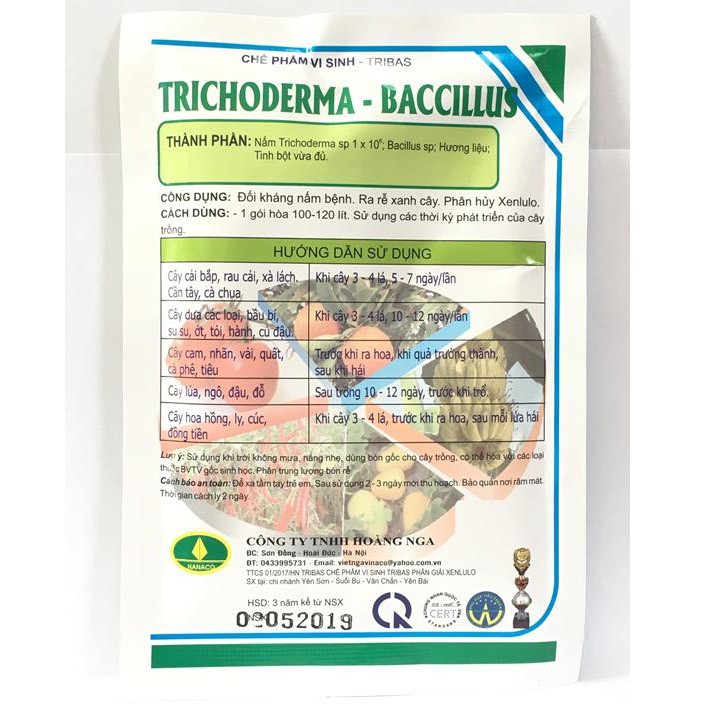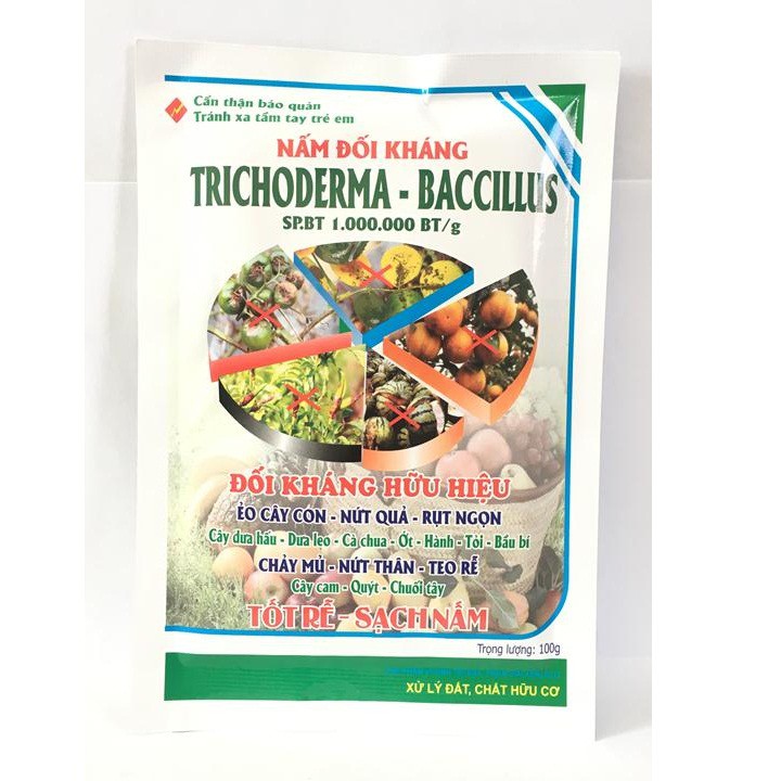 Phân hữu cơ vi sinh Trichoderma Bacilius gói 100g. Chuyên xử lý phế thải, chất hữu cơ và nấm đối kháng.Qui cách sản phẩm: