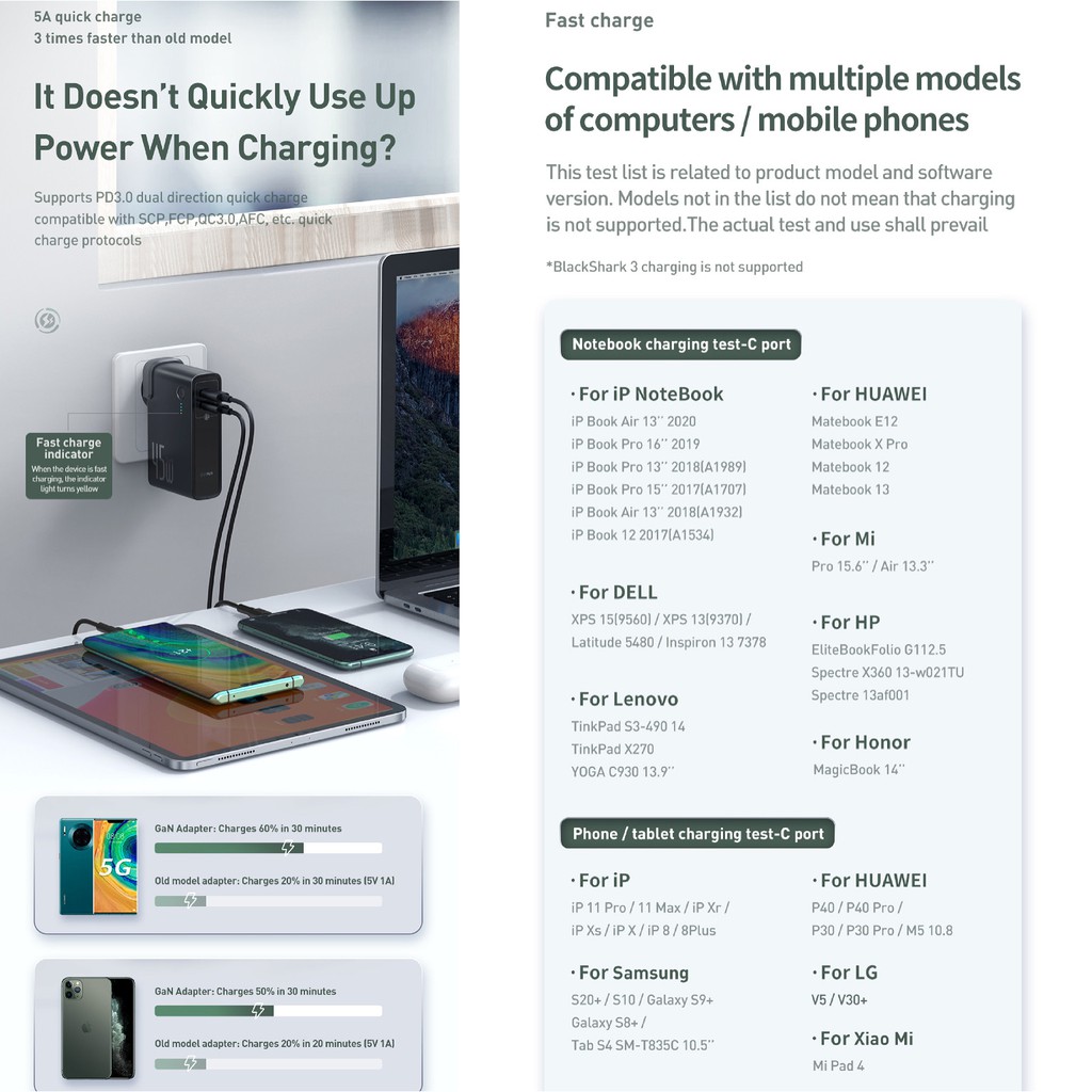 - Với công nghệ Power Delivery thế hệ 3.0 được tích hợp ở cả 02 cổng USB-C, nó tương thích gần như tất cả công nghệ sạc nhanh thông dụng nhất hiện nay, như: FCB, SCP của Huawei, hay PPS, AFC của Samsung, và công nghệ QC 3.0 phổ quát