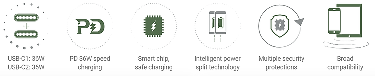 - Output: USB-C1: 5V / 3A, 9V / 3A, 12V / 3A, 15V / 2.4A, 20V / 1.8A, 36W.