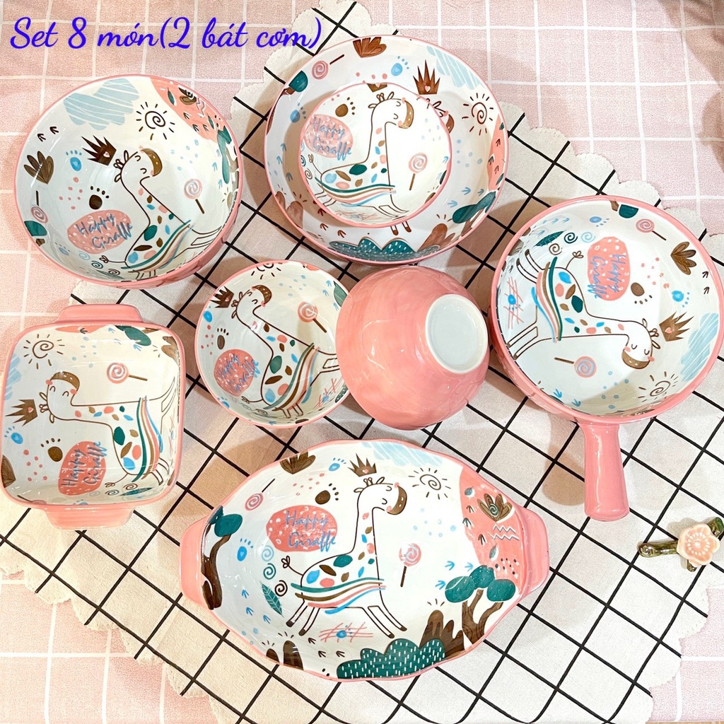 Set Bát Đĩa Decor Hươu Hồng Bát Ăn Cơm Chén Dĩa Dễ Thương Bát Ăn Dặm Cho Bé