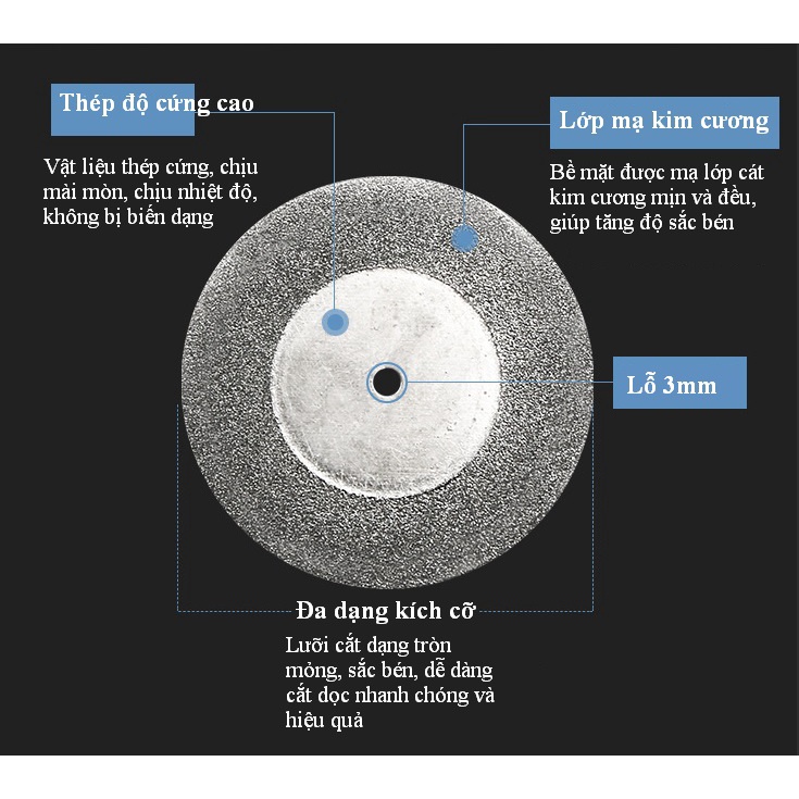 SV Lưỡi cắt hợp kim mạ kim cương mini lỗ giữa 3mm cho máy mài khuônLưỡi cắt hợp kim mini được phủ kim cương ở cả 2 mặt lưỡi cắt dùng để lắp vào các loại máy khoan, mài , khắc cầm tay…. để cắt nhựa, gỗ, nhôm, kim loại…và các vật liệu mềm khác.