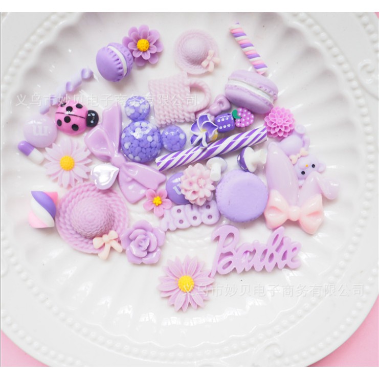 Các mẫu charm bánh, kẹo, hoa tông màu tím nhạt trang trí nhà búp bê, tiểu cảnh, vỏ điện thoại, DIYChất liệu: nhựa cứng ABS.