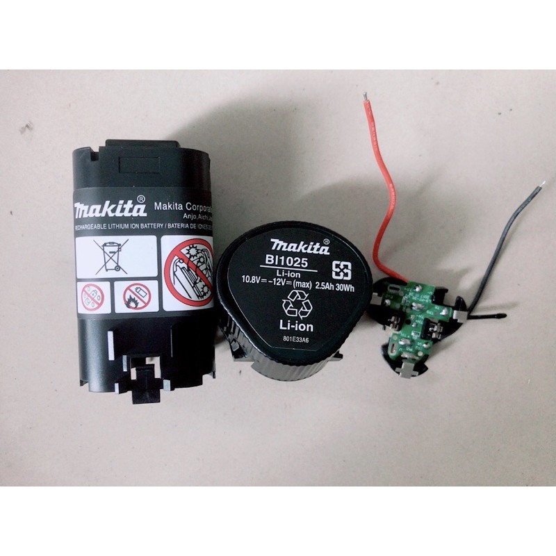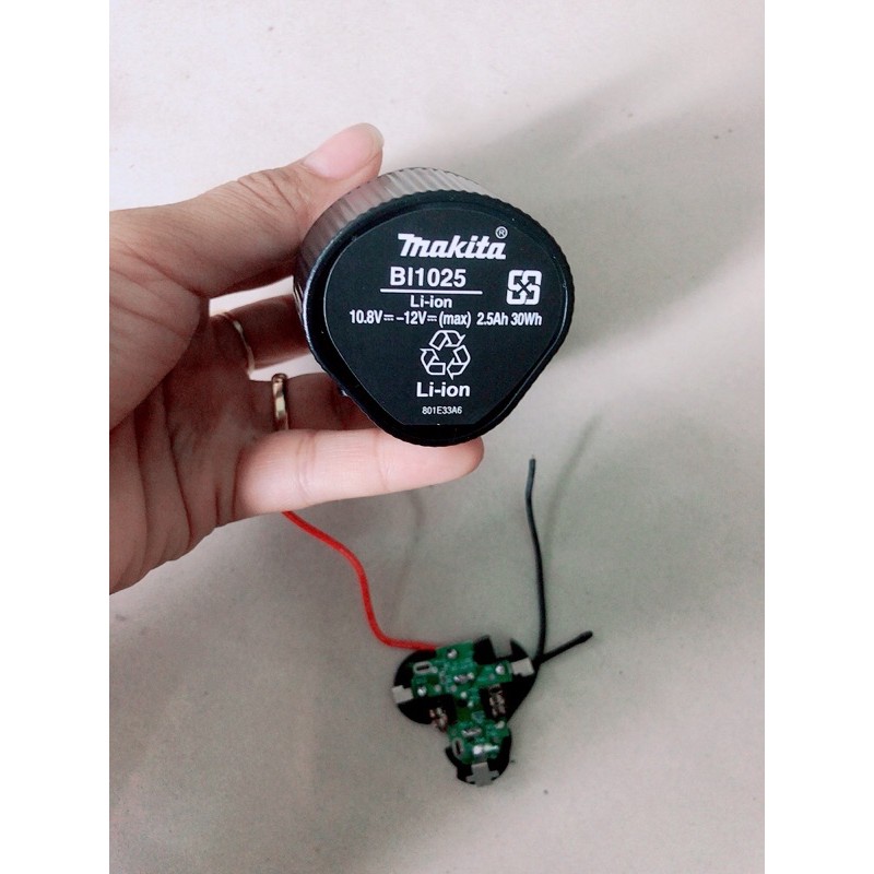 - vỏ, mạch pin Makita 10,8V- Vỏ, mạch pin Makita 10.8V, loại vỏ trụ tam giác 3 cell Li-ion 18650 và nhận sạc zin Makita.