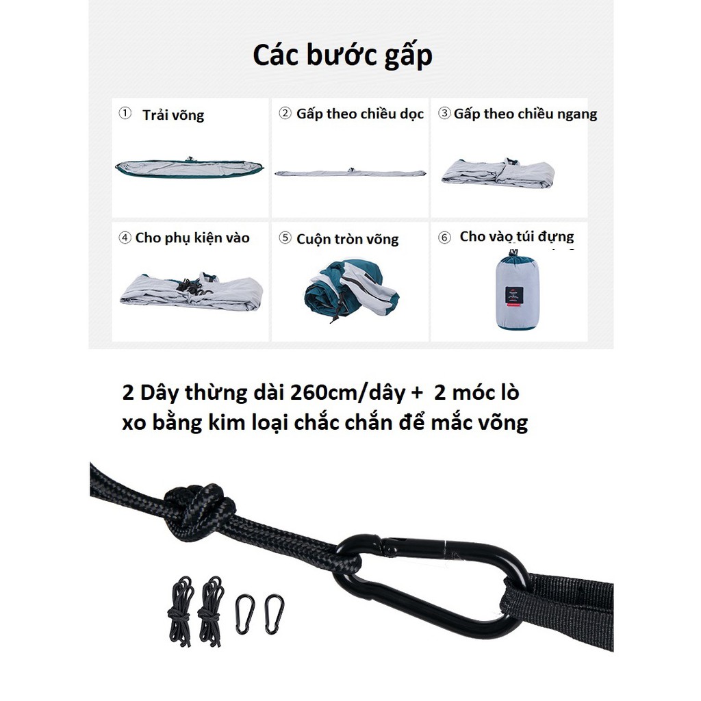• Tặng kèm 2 móc lò xo đa năng bằng kim loại chống ăn mòn và 2 dây thừng buộc võng dài 260cm