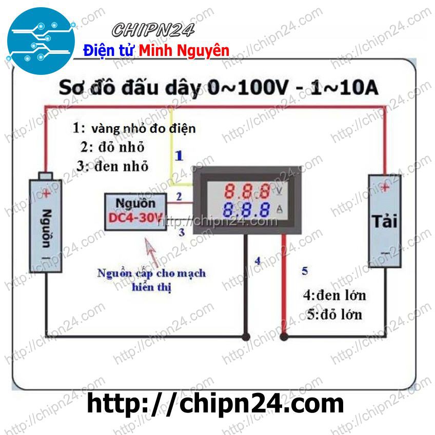 Module Đo Dòng Áp 0-100V 10AĐồng Hồ Đo 0-100VDC/0-10A Hiển Thị Volt/Ampe hiển thị LED đỏ là vôn, LED xanh dương hiển thị Ampe, được tích hợp cả 2 hàng lên đồng hồ, đồng hồ đo vôn/ampe được thiết kế với mass chung.