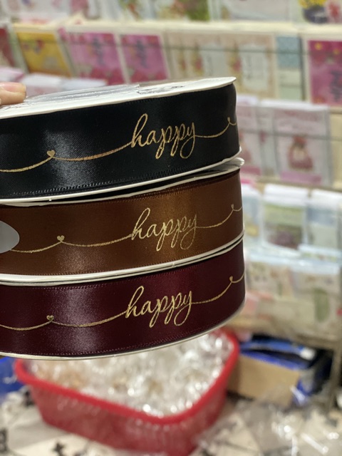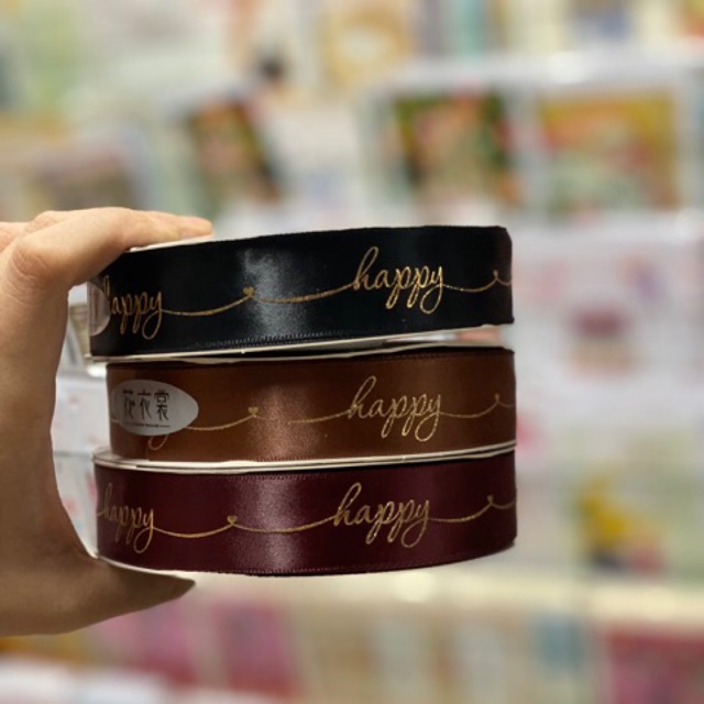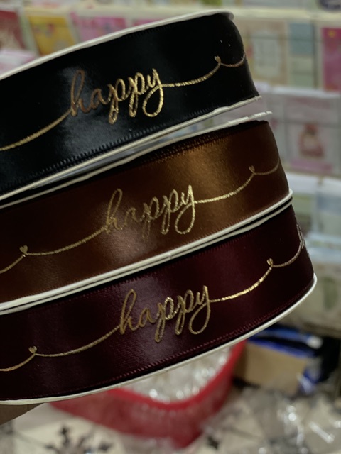 1 cuộn lụa đẹp bản 2.5 cm có chữ Happy in nhũ dùng để bọc quà trang trí bánh các loại