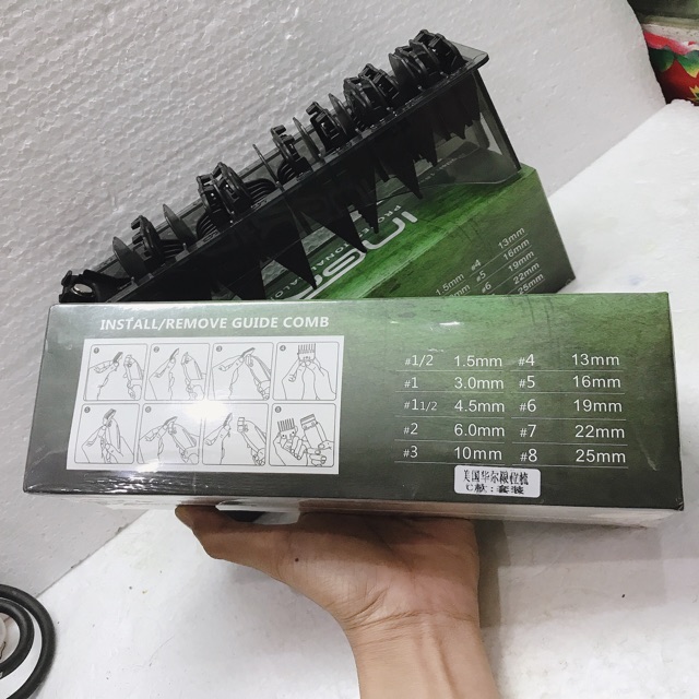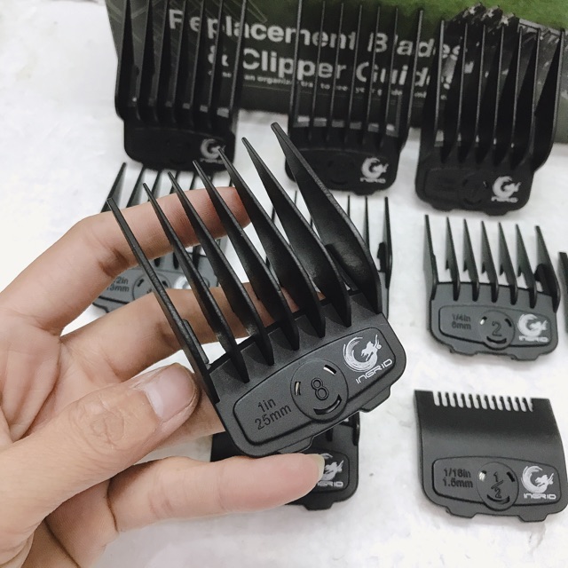 Bộ cữ ngàm tông đơ 10 Độ dài gồm: 1.5mm,3mm, 4.5mm ,6mm, 10mm, 13mm, 16mm, 19mm, 22mm, 25mm có đế chứa- Chất liệu nhựa ABS cao cấp