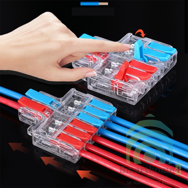 Không cần quan tâm phải nối hay quấn dây điện với nhau đúng cách thế nào. Chỉ việc xỏ các dây điện vào cút nối và gạt cần gạt nhiều màu giữ chặt dây là xong, cút nối điện LT được thiết kế 2 có thể chia 2 dây vào với 4 hoặc 6 dây ra.