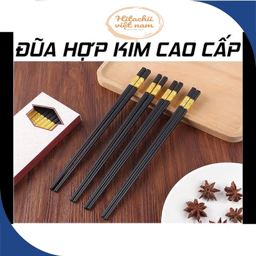- Đũa hợp kim mạ vàng, 1 hộp 10 đôi đũa hợp kim mạ vàng chịu được nhiệt độ lên đến 260 độ C
