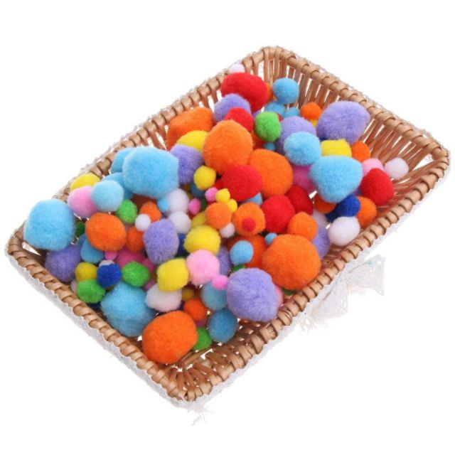 100 quả bóng pompom dùng trang trí gồm size 10mm 25mm 30mm 40mm / 10 màu hỗn hợpChất liệu: plush