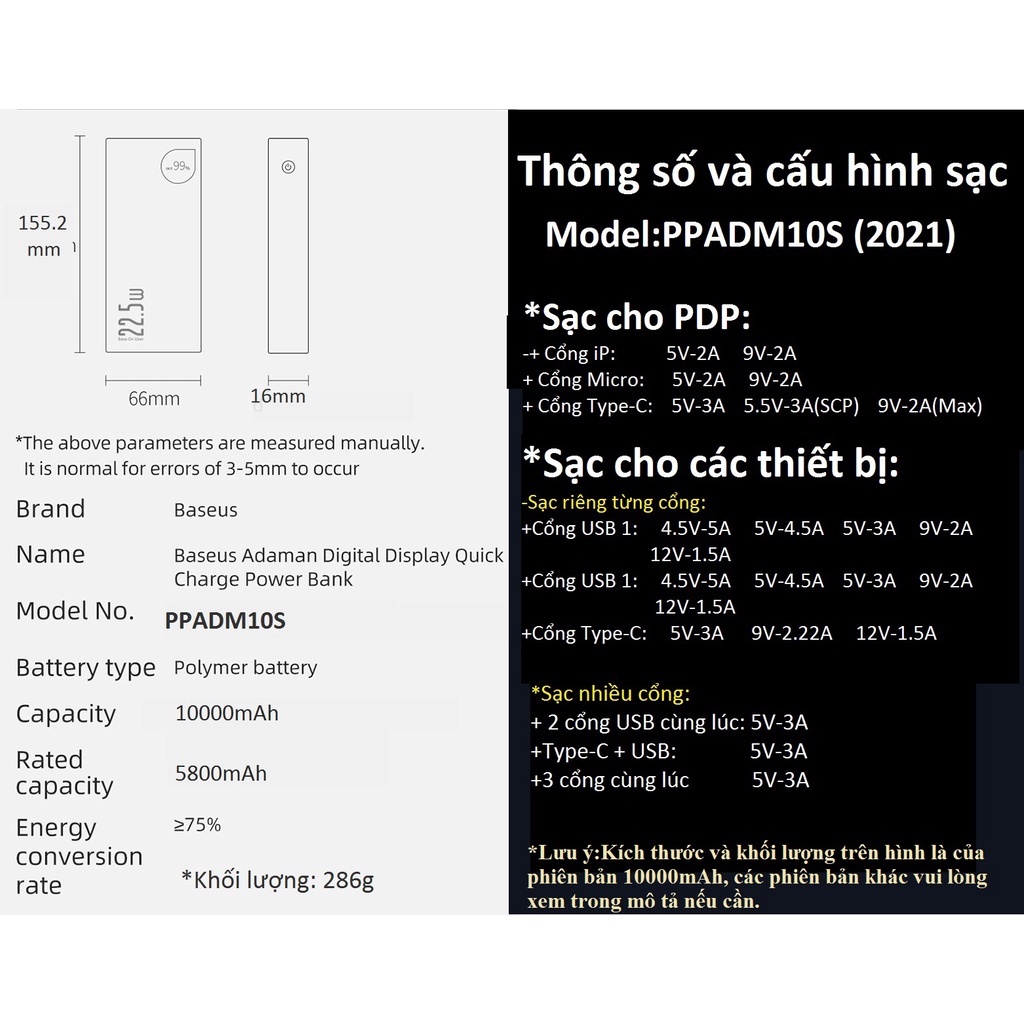 -Dung lượng pin: 10000mAh/20000mAh ( sử dụng thực 5800mAh/ 120000mAh)