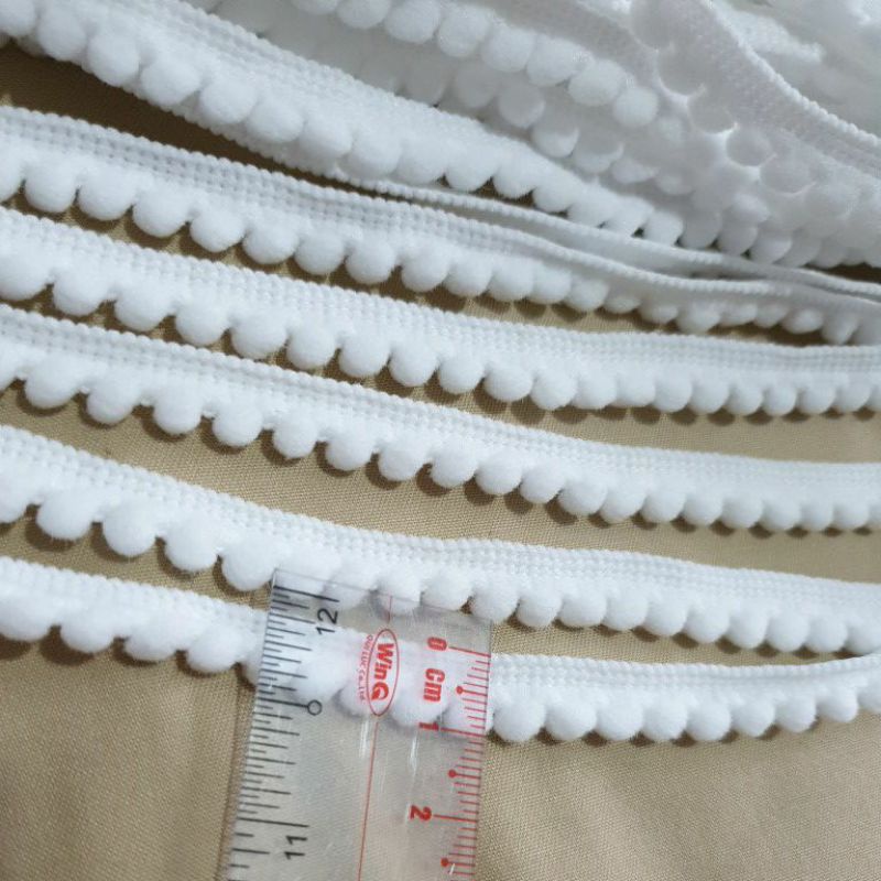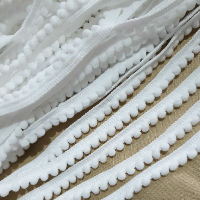 Dây viền pompom trắng, chất ren mềm mịn, nhẹ như bông, dày dặn không co giãnBản rộng 1cm, Dây 10m/18k, có dây 5m/10k